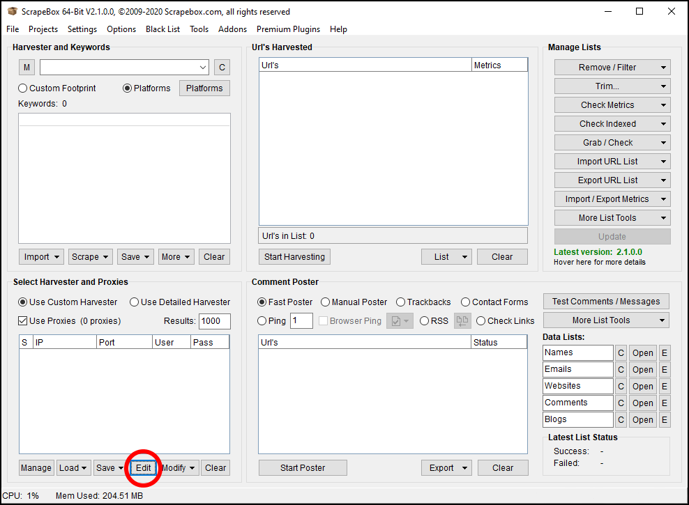 Start Scrapebox and once it’s loaded, click in the “Edit” button down in the bottom-left, in the “Select Harvester and Proxies” section.