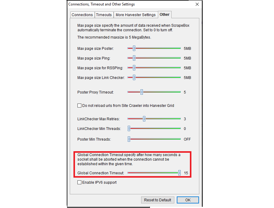 Now click on the “Other” tab and slide the “Global Connection Timeout” slider all the way to the right.