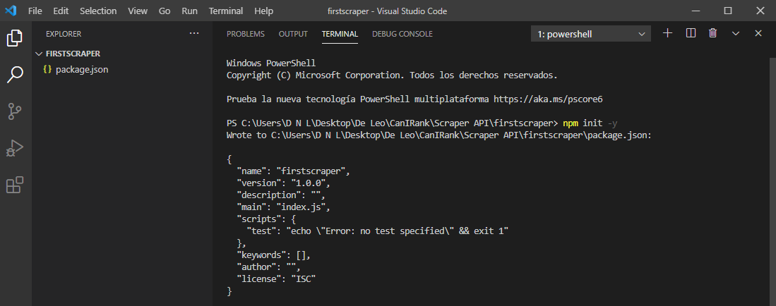 After Node.js is installed, create a new folder called “firstscraper” and type npm init -y to initialize a package.json file.