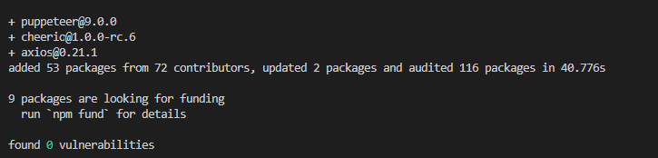 Then we’ll install our dependencies by running npm install axios cheerio puppeteer and waiting a few minutes for it to install.