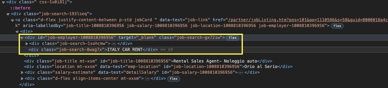 The selector for the company’s name would look something like “div.job-search-gx72iw > div.job-search-8wag7x”.
